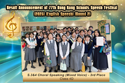 是次比賽5C班洪鎂楟及5C班盧錦軒在二百名參加者中脫穎而出,躋身決賽。洪鎂楟同學在決賽表現出色,榮獲優異獎。盼本校普通話朗誦隊來年淬礪奮發,更進一步。